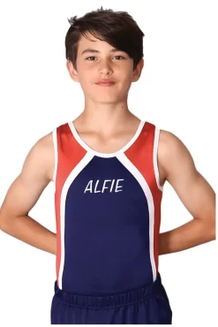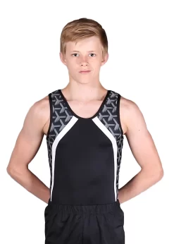 EMERSON – BV551:- Boys Sleeveless Leotard In White Matt With Black And Turquoise Detail