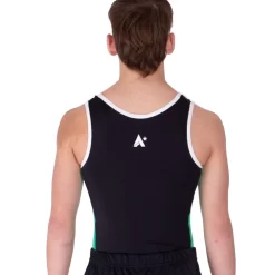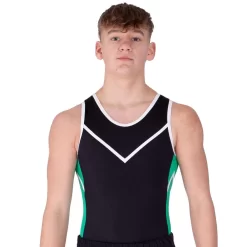 Looking for gymnastics leotards for boys? We have just the thing! This Black, White and Green gym leotard is made from soft lycra. The side details are great for trampolining.