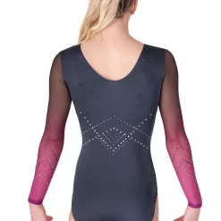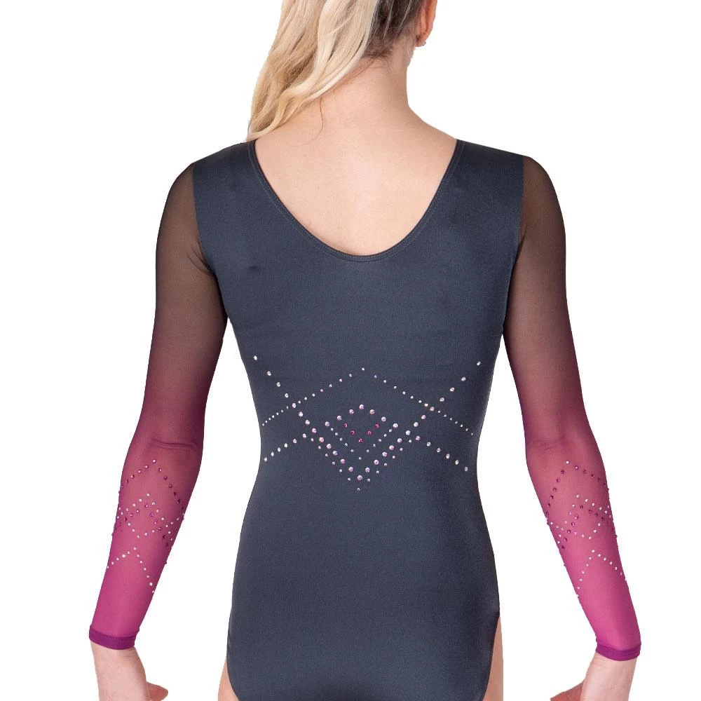 Beautiful long sleeved girls leotard in Grey Shiny Lycra with Pink the Black Ombre Powernet sleeves.