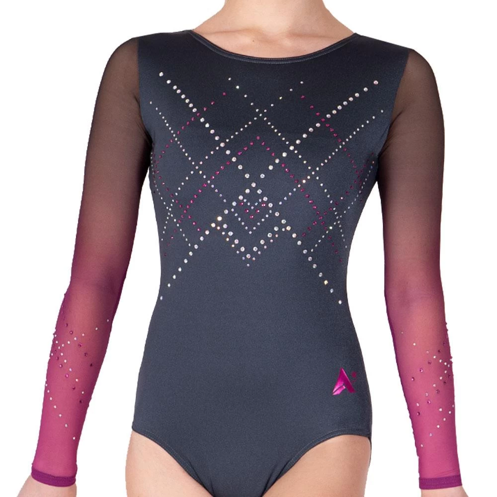 Our Grey Leotard with pink Ombre sleeves and pretty diamante is perfect for competition. Looking for gymnastics catsuits? We can help! We can turn any A Star leotard into a catsuit or work with your to create a bespoke competition catsuit. For free fabric samples, a free mock-up or a quote contact our helpful team on 01884 266226.