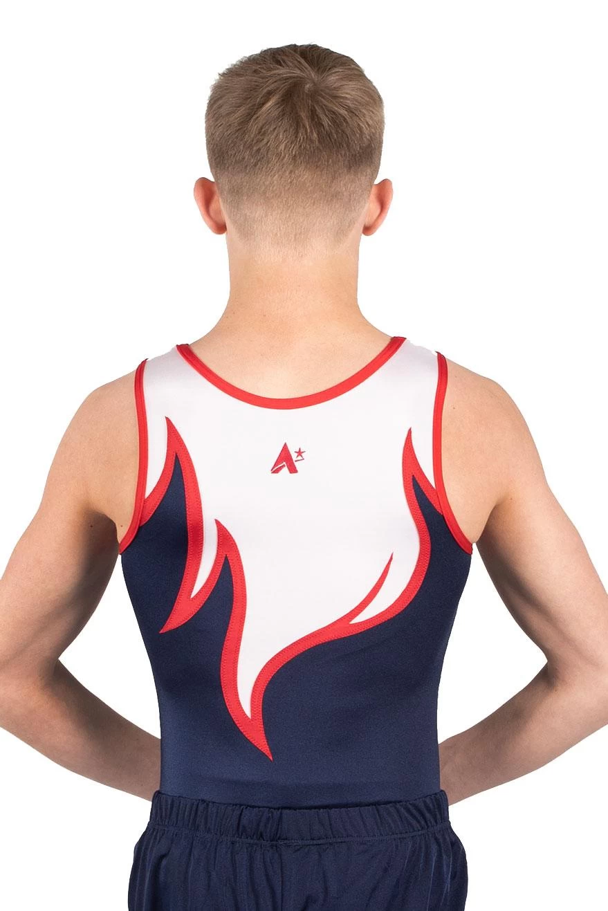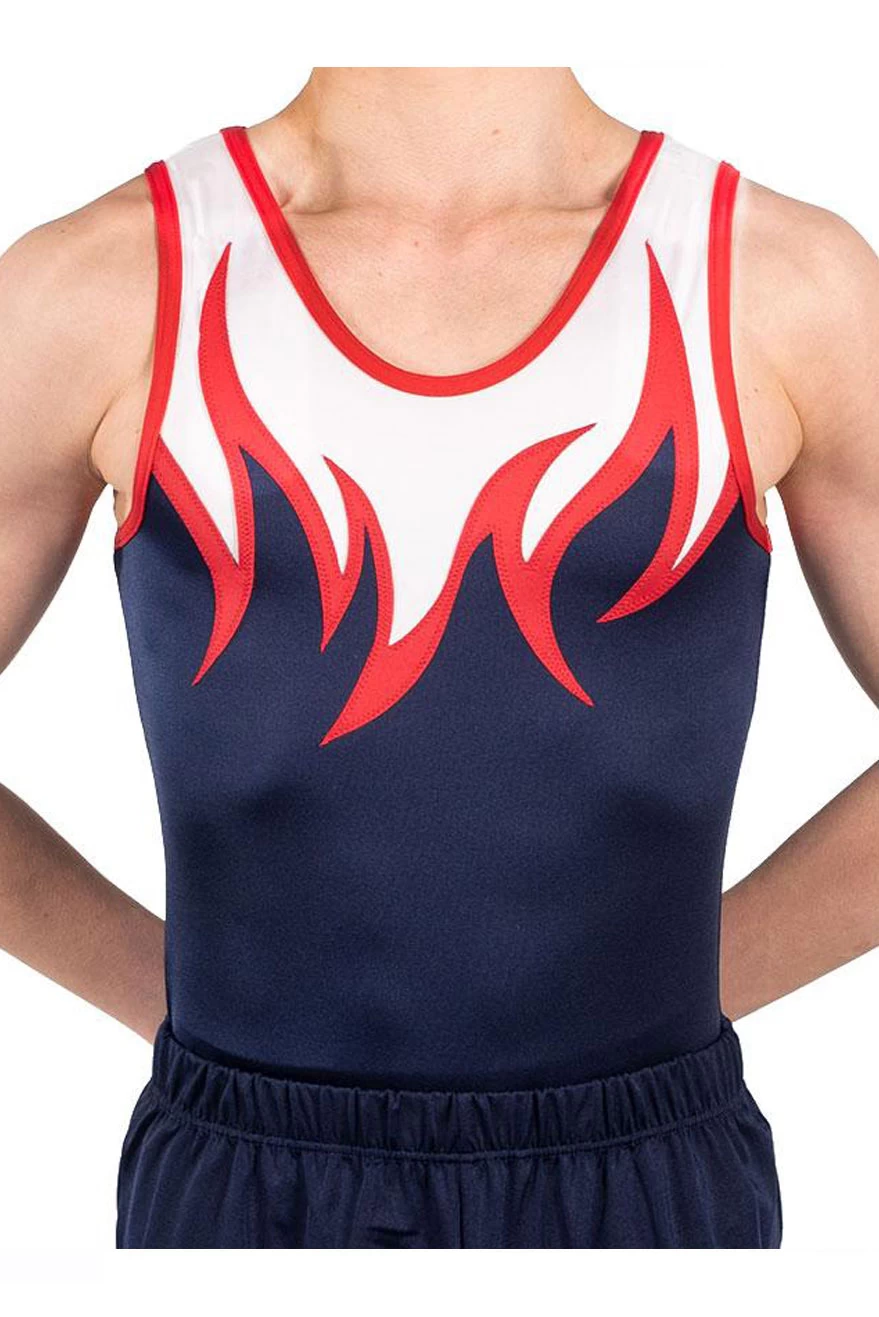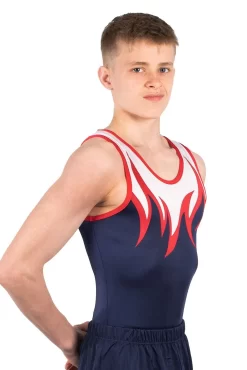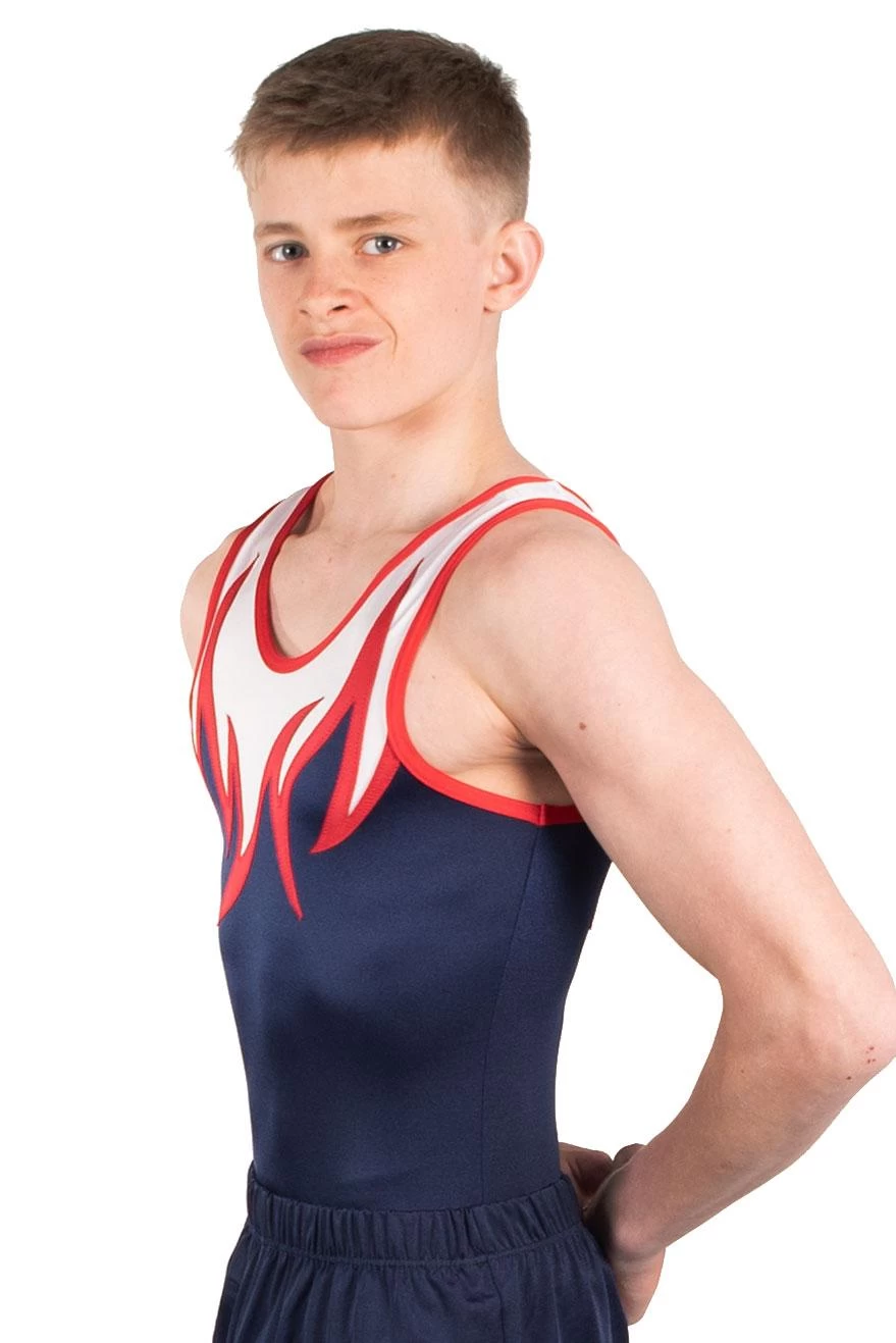 Sleeveless gymnastics boys leotard in Navy shiny lycra body, White top section with red a flame detail. This is the perfect training leotard for boys of all ages.