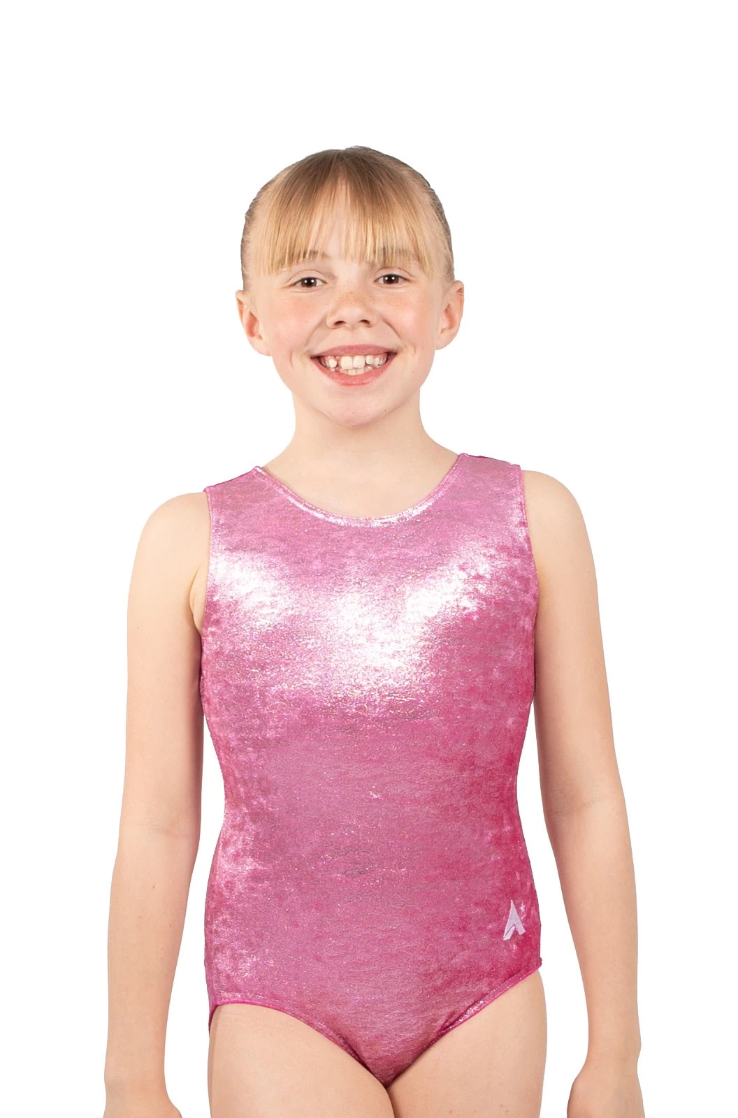 BABY PINK SHIMMER VELOUR – SP-FS15: – Girls Sleeveless Gymnastics Leotard In Pink Velour With Shimmer Foil