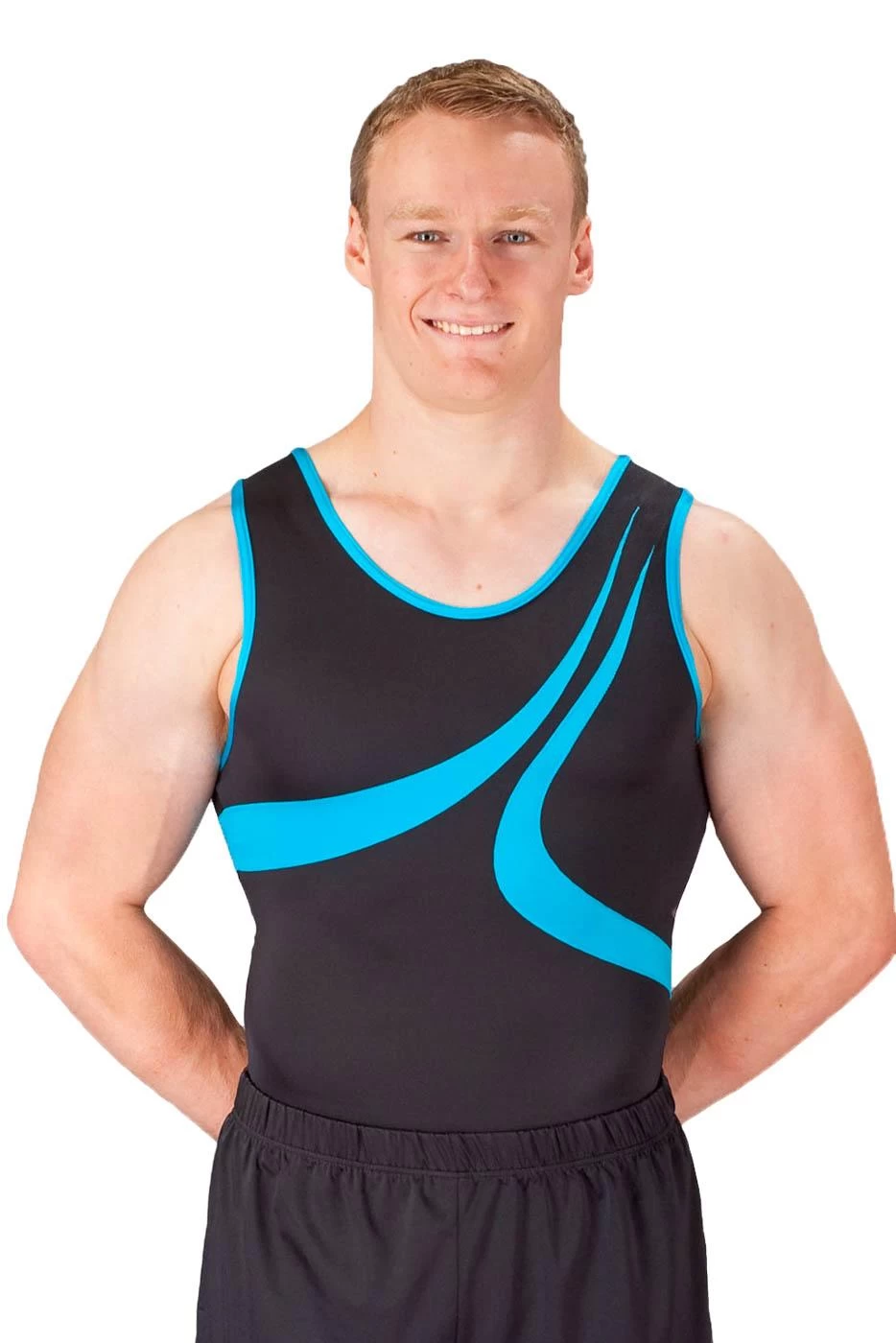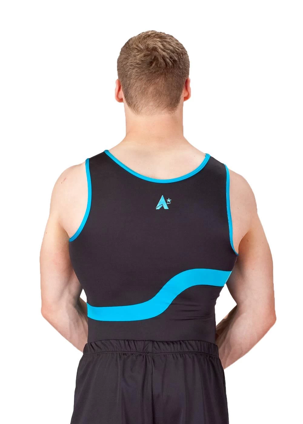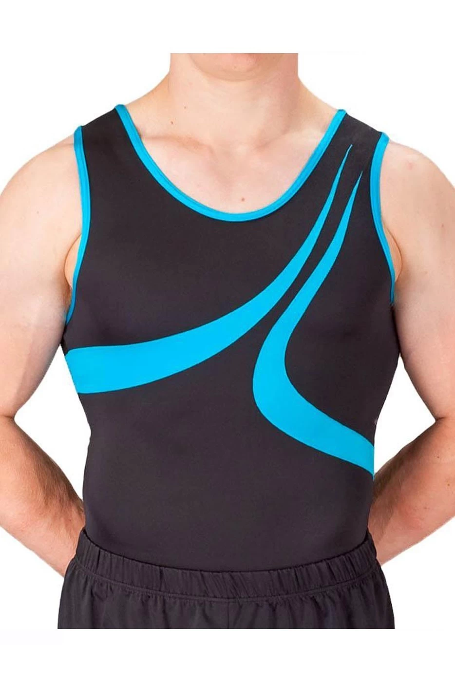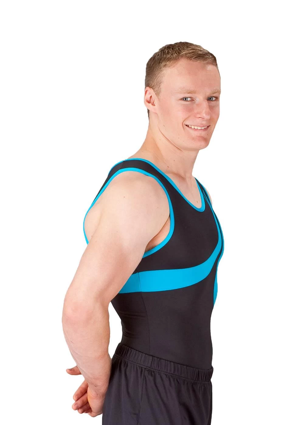 Boys black lycra leotard with turquoise blue details. Great for training and competitions. To complete this look please see our Boys Shorts and Boys Stirrups.