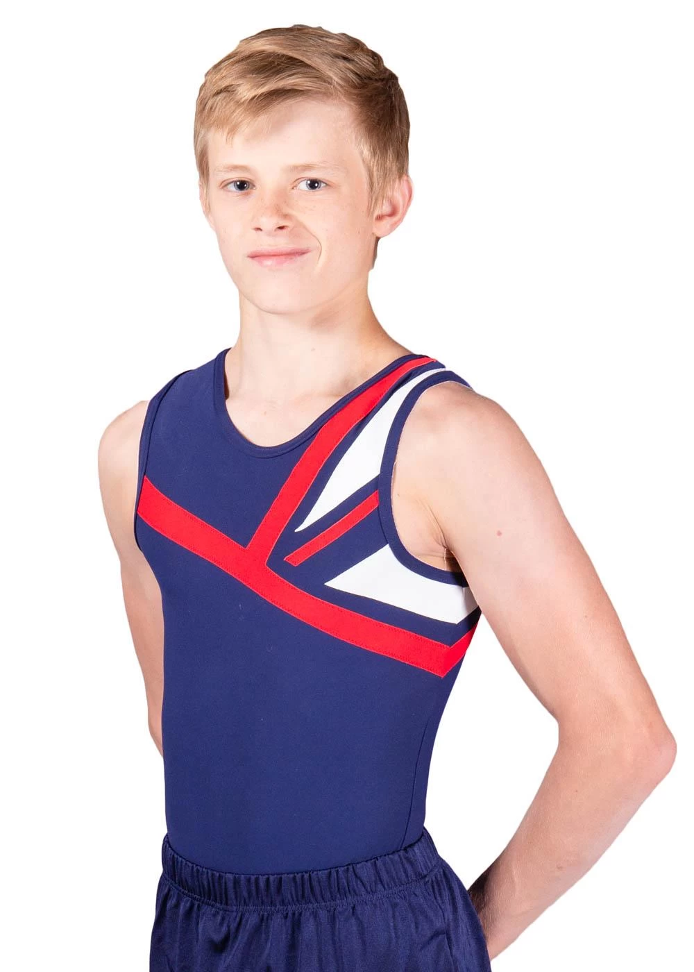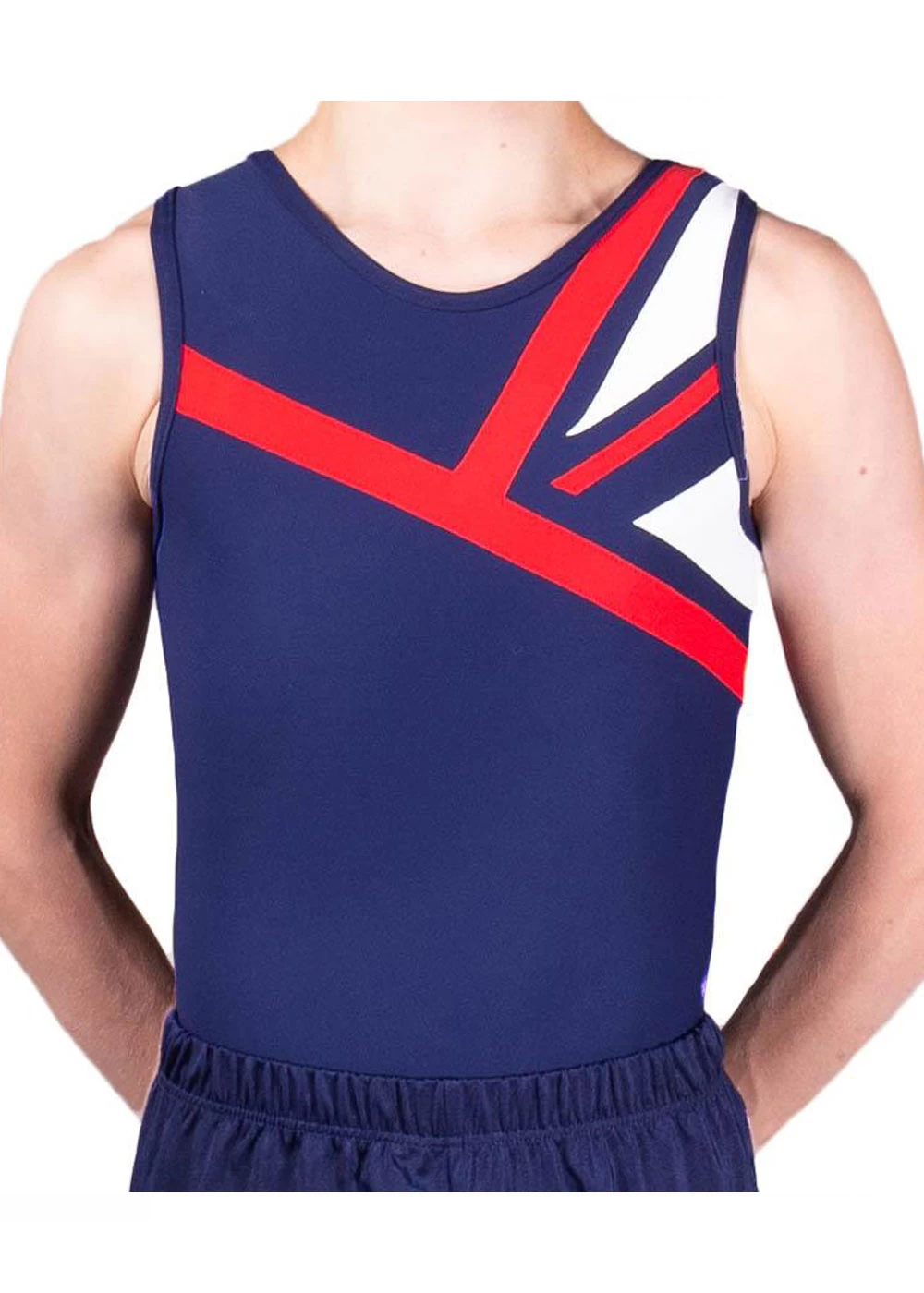 Boys Navy Matt lycra body with White matt and Red Matt Union Jack design across the shoulder. We use fabrics that are specifically designed for sportswear offering a freedom of movement to ensure you can show of your moves in gymnastics training.
