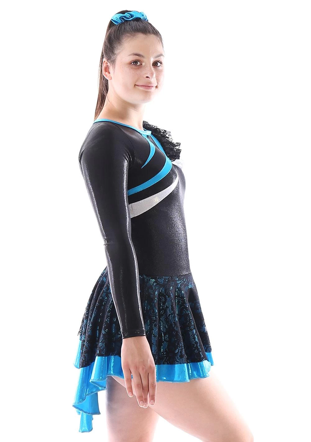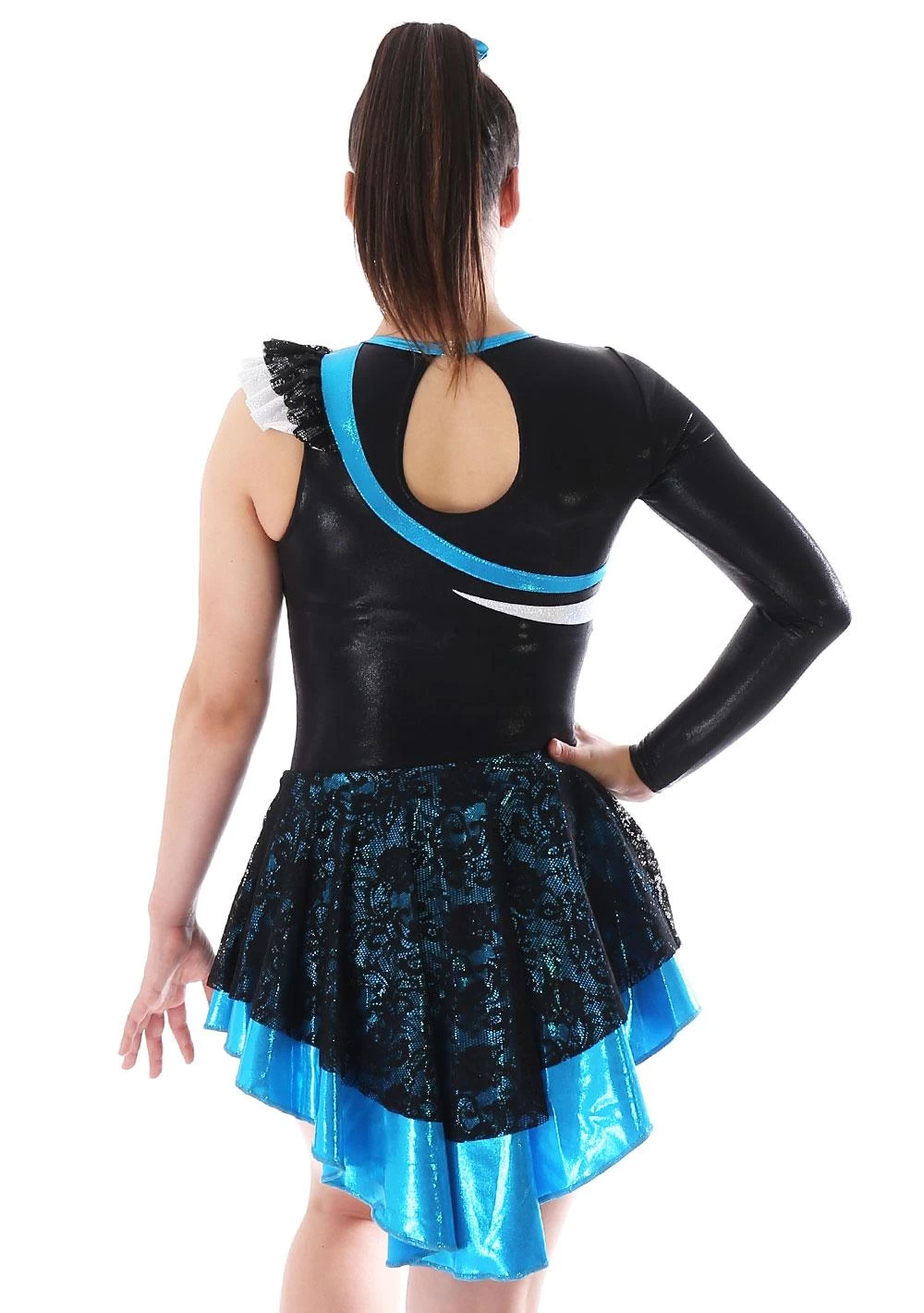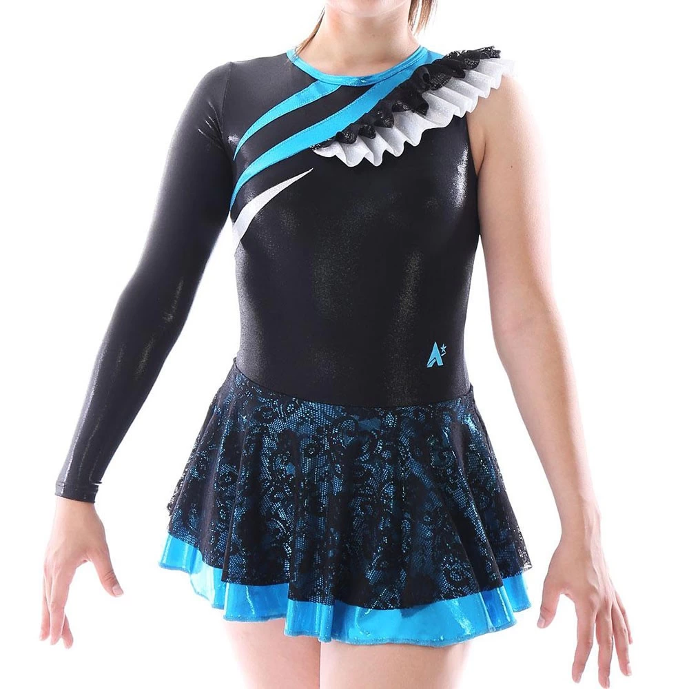 CLARISSA long sleeved skirted leotard in Black Shimmer with Black Lace skirt lined in Azure shimmer with silver and azure shimmer details. The right shoulder has a stunning ruffle detail created in Silver shimmer and black lace fabric. Hook and eye neck fastening with a keyhole back. Our Shimmer fabrics offer complete foil coverage for a light catching affect, whilst the lycra base provides excellent stretch to offer movement and comfort from this skirted girls leotard. If you like this leotard design but would like to customise it, let us know. As A Star handmakes all our leotards in the UK, we can adapt any of our designs to suit your needs so why not custom make a leotard to suit your taste. So your club can have the same design both gymnastics training and competitions as their standard club kit. If you would like discuss this leotard please call one of our advisors on 01884 266226 who would be happy to help you with any enquiries