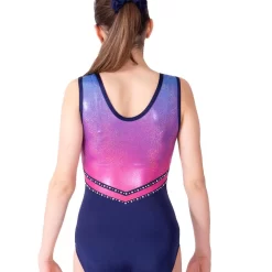 ESME Z663:- Girls short sleeved leotard for girls in Pink to Blue Ombre with Navy bottom and lots of pretty gems to make this a sparkly gymnastics leotards