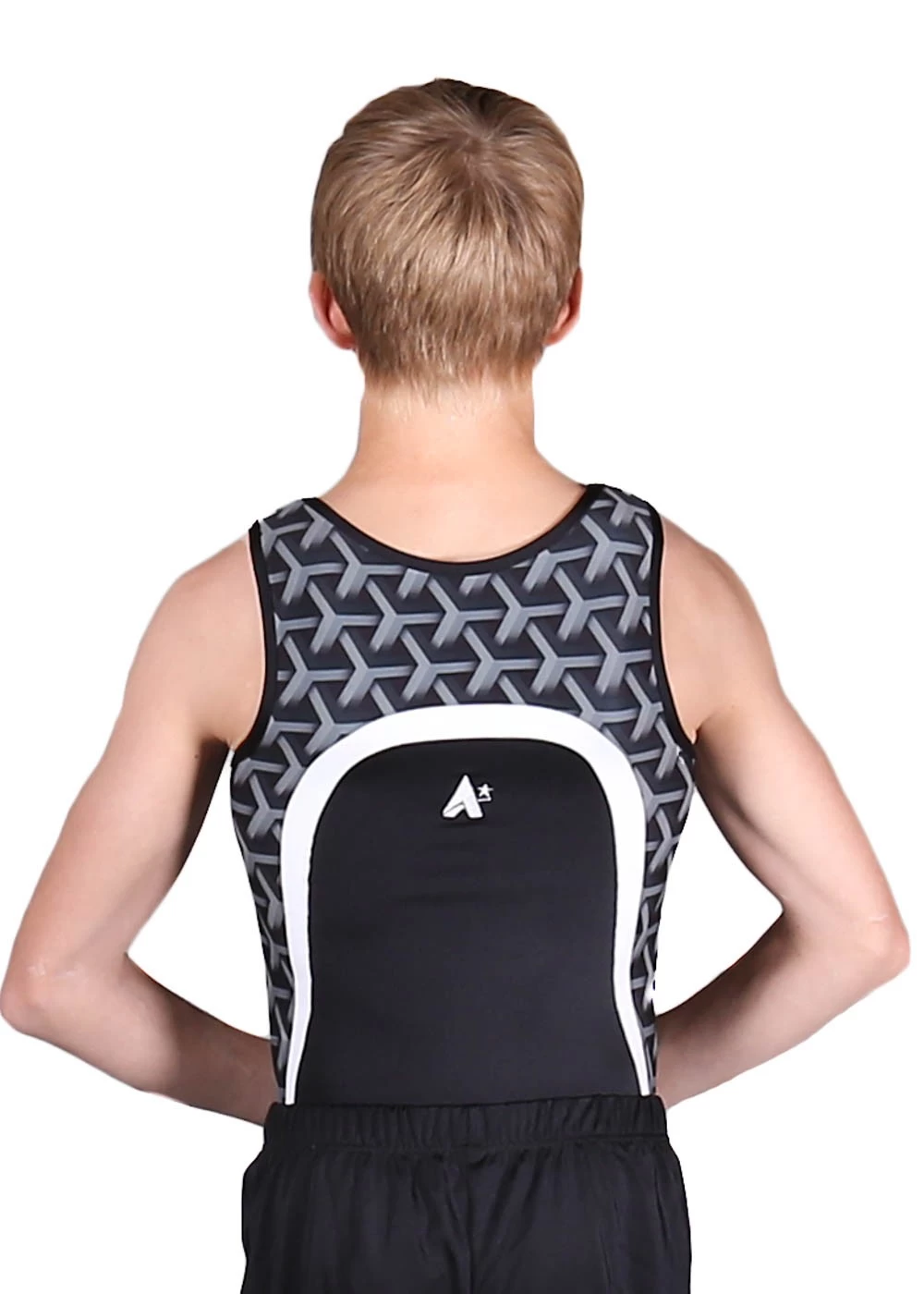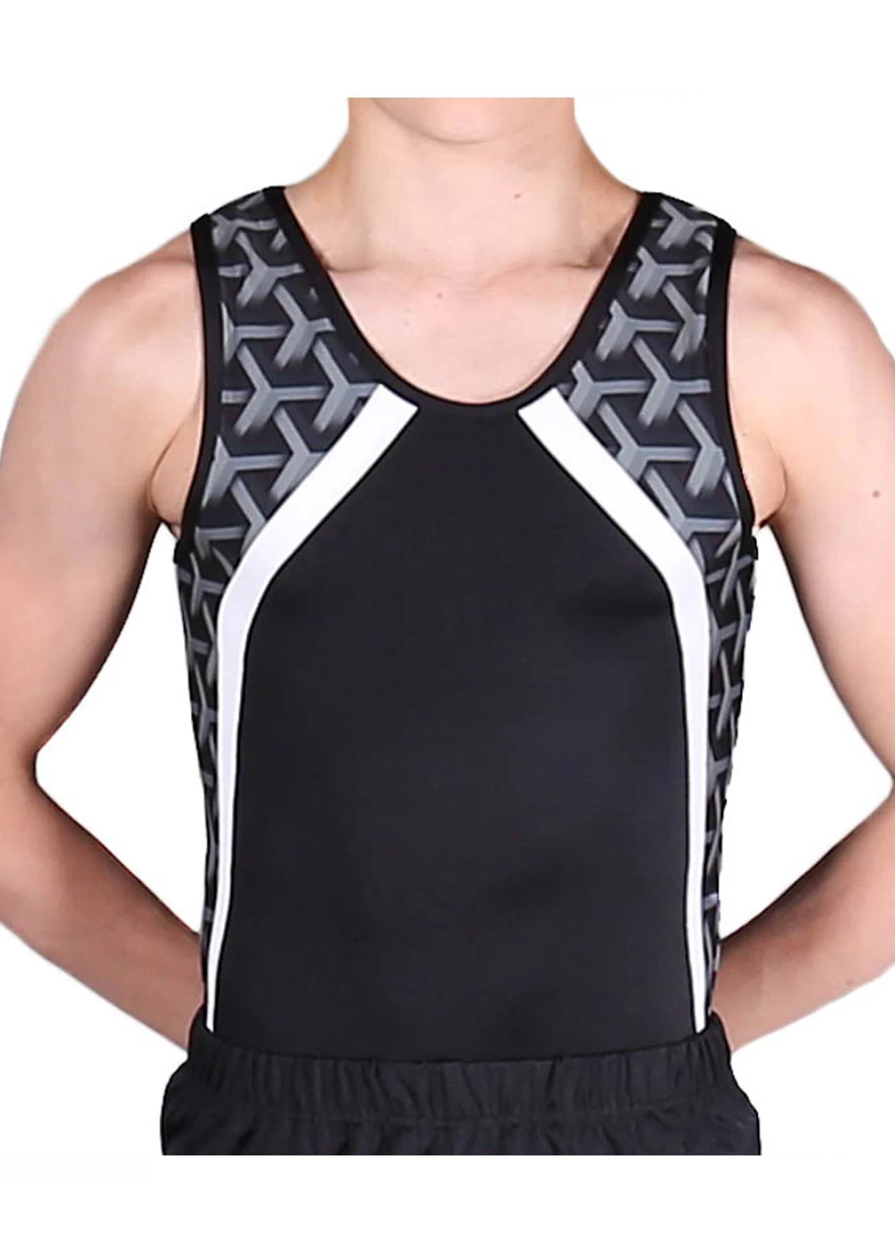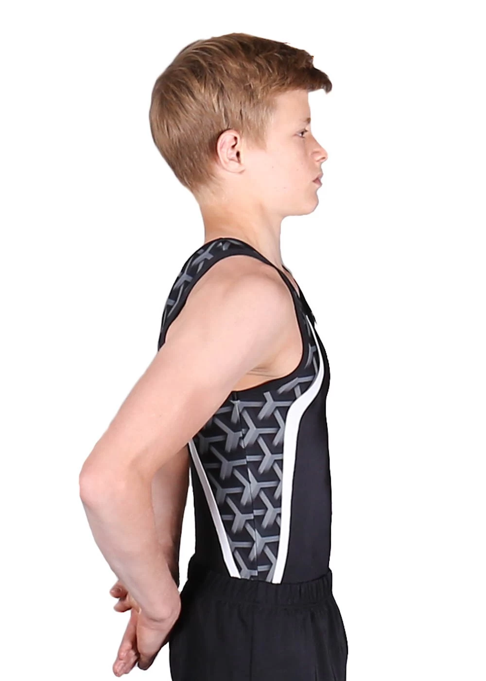 Boys leotard for gym and trampolining. Black body with patterned side. Great for training.
