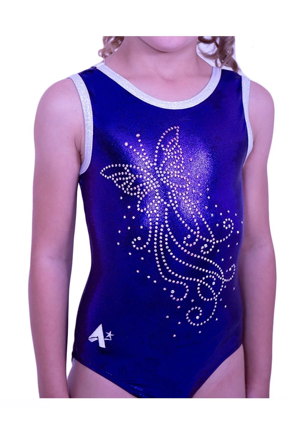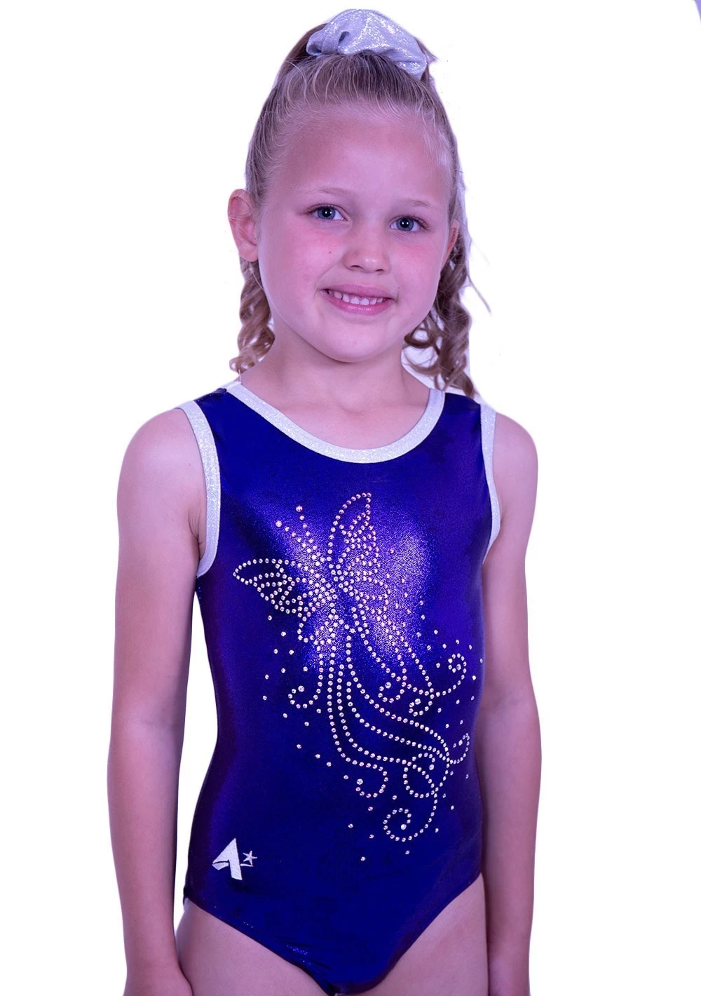 Girls sleeveless leotard in Purple shimmer with gorgeous butterfly diamante. This eye-catching design will help you stand out at training. Affordable but good quality leotard – perfect!