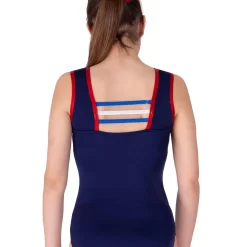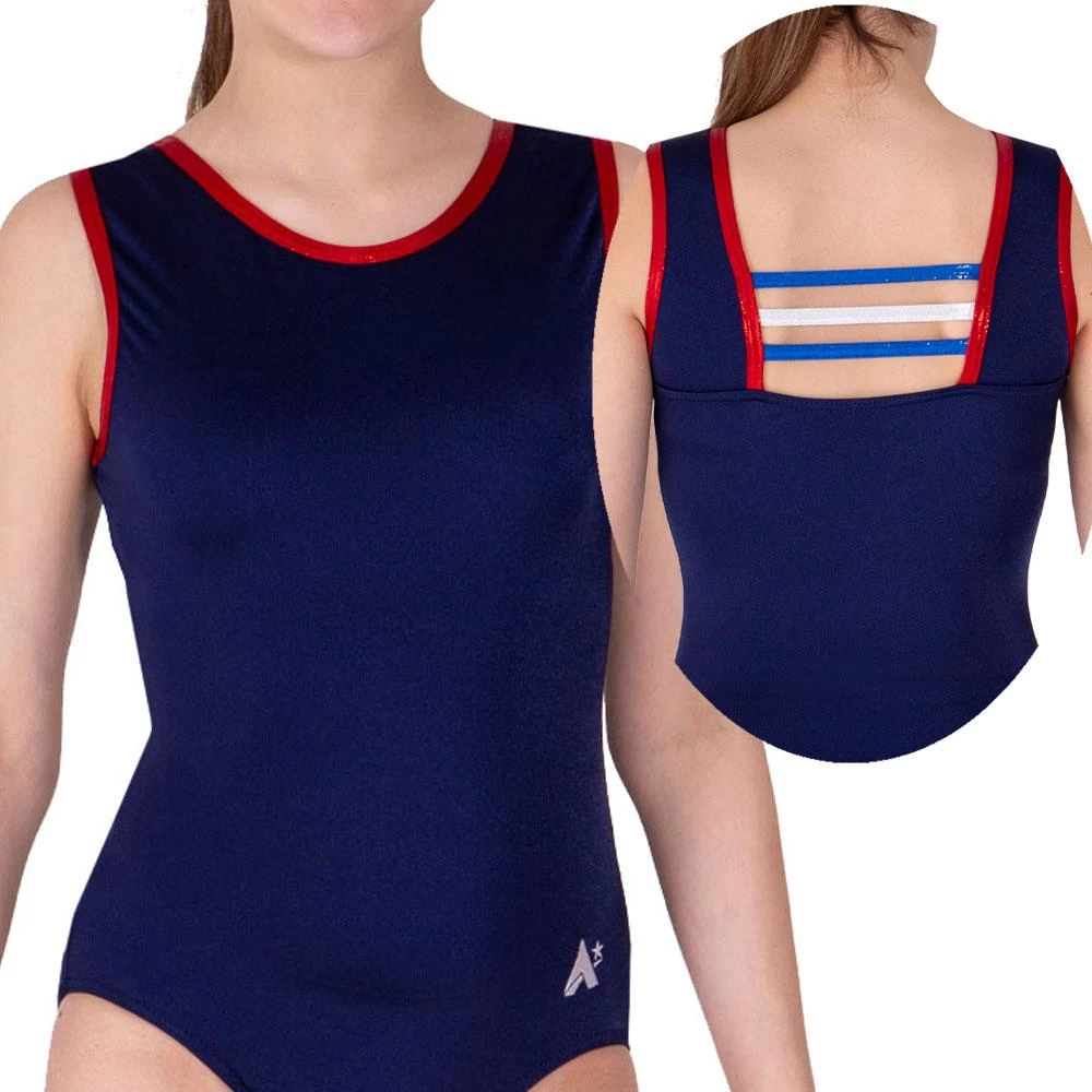 Navy Girls leotard bound in Ruby Shimmer with Silver and Blue strappy back. Perfect for gymnastics or trampoline classes.