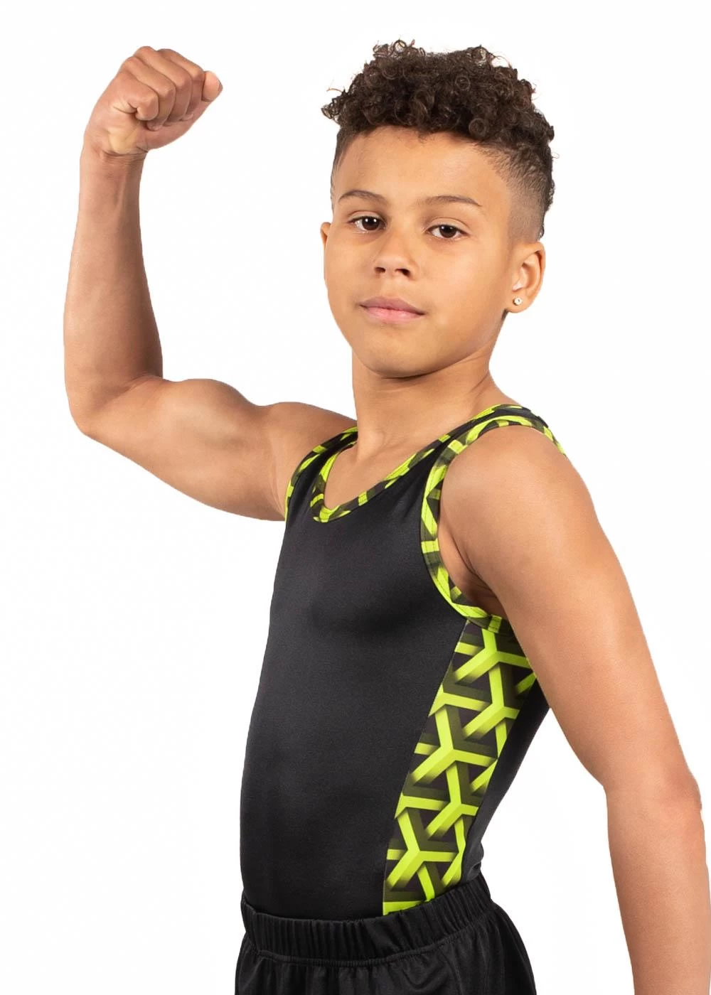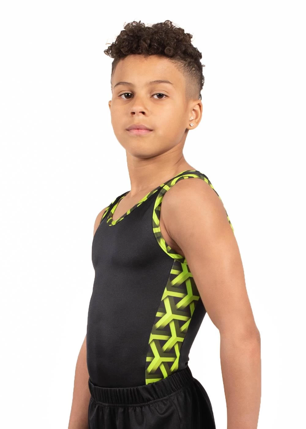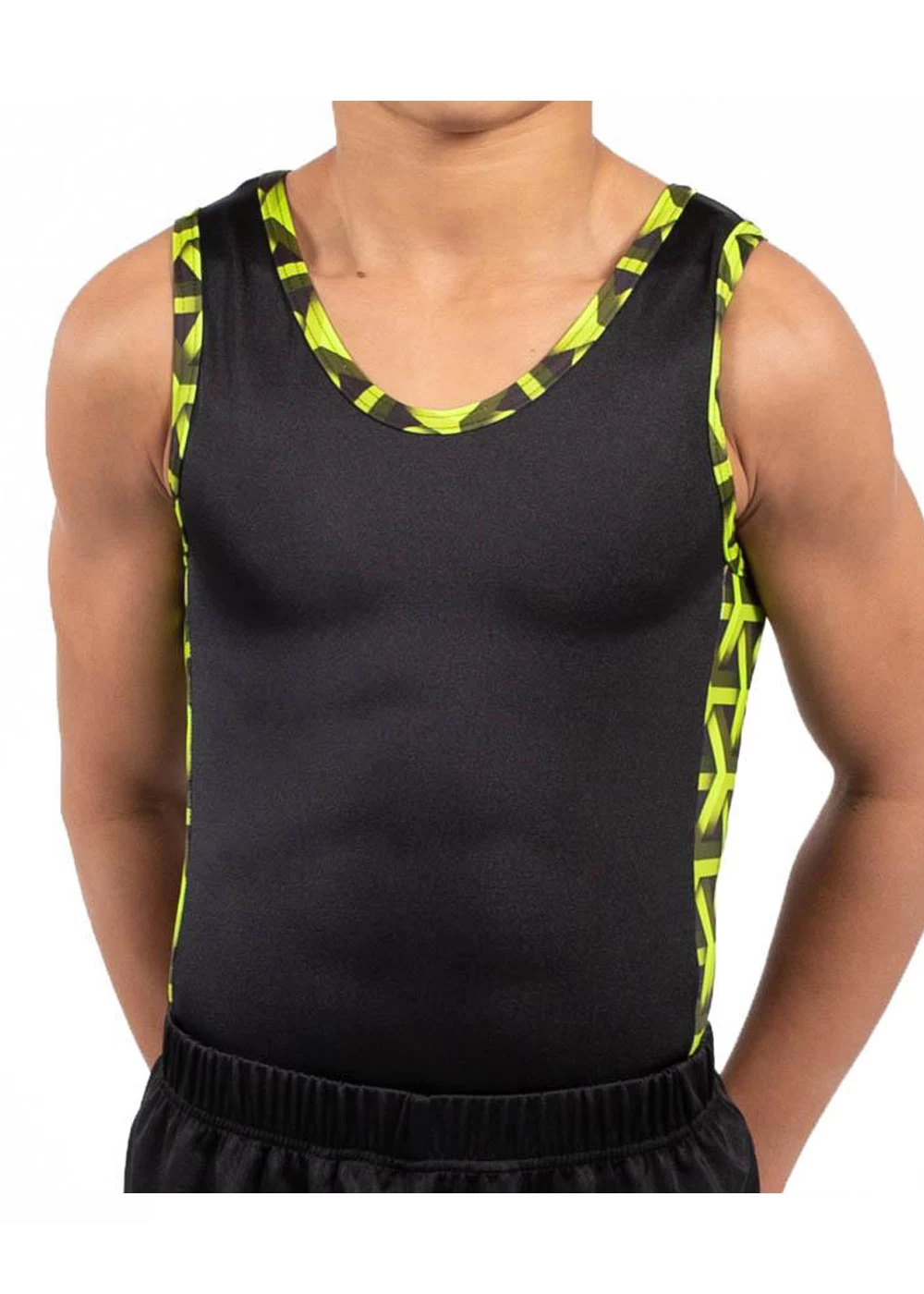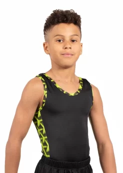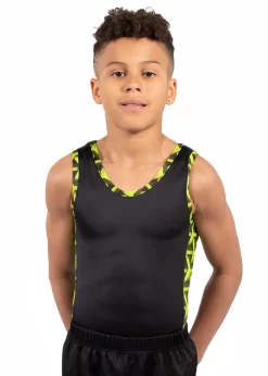 Our MATTHEW leotard is the perfect training gymnastics leotard for boys. This menβs sleeveless gymnastics leotard in Black shiny lycra with our exciting new Lime Green Geo printed fabric in panels down the sides. This is the perfect training leotard for boys This leotard is available in other colourways or we can change the colours to match your club. All our mens leotards can be purchased with a standard leotard bottom, or with a boxer bottom. If you have any questions about this amazing leotard please contact our helpful staff on 01884 266226. If you are unsure on sizing, our handy size guide tab can help you with how to measure and find the best leotard. If you would like to adapt this design or make this your own club leotard please call is on 01884 266226. All of our leotards are designed and handmade in Britain.