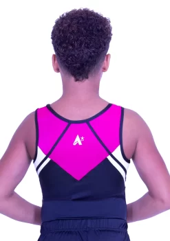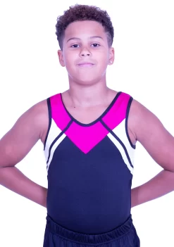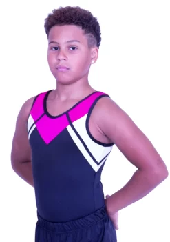 Boys gymnastics leotard in Black, White and Pink. This leotard is made from a comfortable lycra and the fun bright design will ensure that you stand out at training.