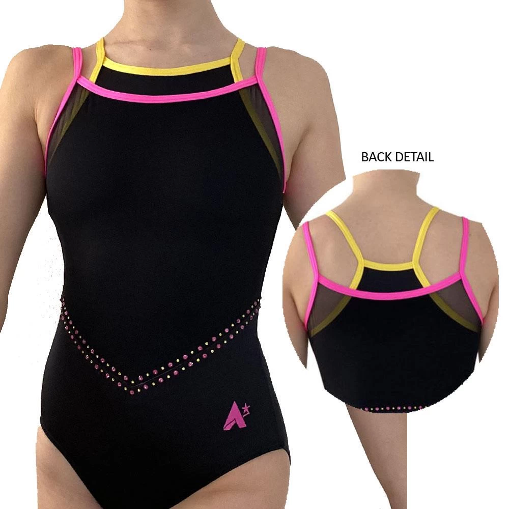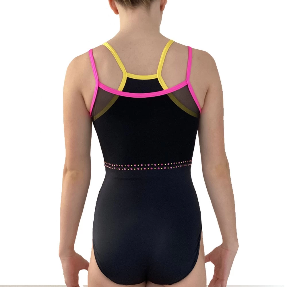 - Black leotard with mesh and colourful binding