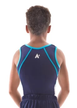 NOAH Mens sleeveless leotard. Navy shiny lycra body with White Shiny Fabric Side panels, Turquoise Shiny Lycra Details finished with White matt binding around the neck and armholes. Our NOAH is available in many different colourways, or we can create a custom leotard based on the colours that you choose. Our NOAH leotard is an affordable gymnastics leotard, without comprising on quality. All of our leotards are made to order, and You can either have your NOAH leotard as a standard leotard bottom, or as a boxer bottom leotard. We also have matching shorts available. If you are unsure on sizing, our handy size guide tab can help you with how to measure and find the correct size for your leotard. To make this your club leotard call our team on 01884 266226 we can offer discounts on larger orders or adapt the design to meet your budget.