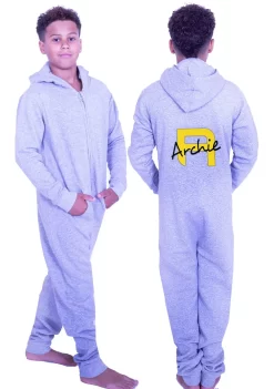 - Unisex Grey Onesie with Name print in Yellow and Black
