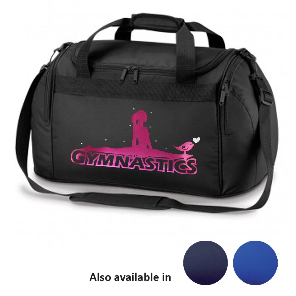 Holdall bag with Cherry Pink Print and diamante to sparkle. Free personalisation, name will be printed on the top of the bag in pink. Once personalised this product is non-returnable. This holdall is ideal for the school and gym. The capacity of this bag is 26 litres. Its dimensions are 54 x 25 x 28cm. Making it the ideal size for your gymnastics kit. Padded hand grip. Detachable adjustable shoulder strap with pad. We can add your name to our holdall bags to avoid mix-ups at school or in the gym.