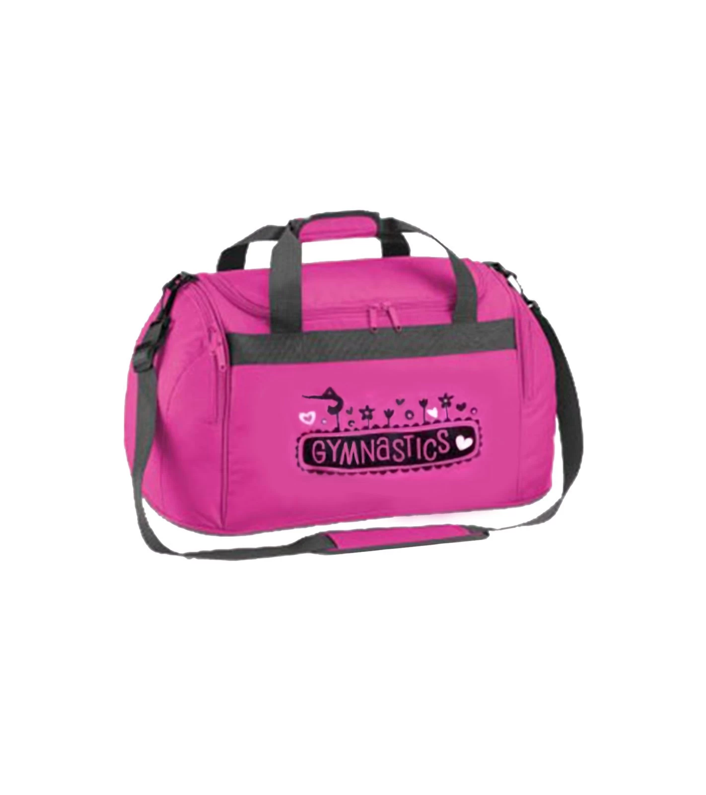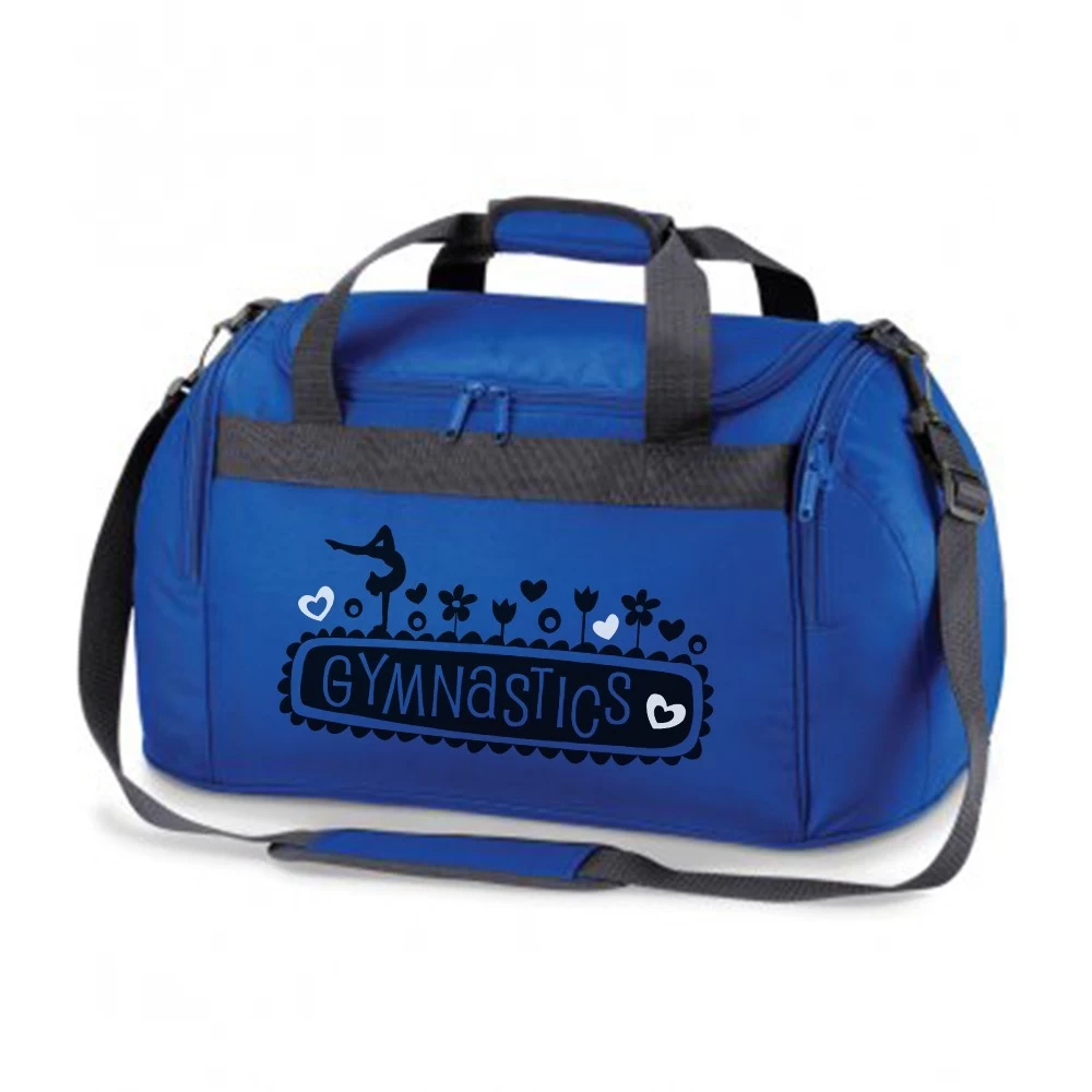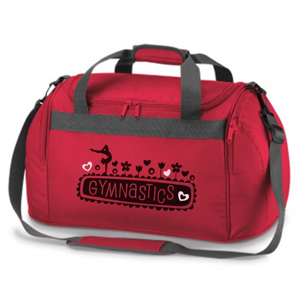 Holdall bag with Black and White gymnastics print. This holdall is ideal for the school and gym. The capacity of this bag is 26 litres. Its dimensions are 54 x 25 x 28cm. Making it the ideal size for your gymnastics kit. We can add your name to our holdall bags to avoid mix-ups at school or in the gym, name will be printed on top of the bag in Black print. Holdall available in Pink, Red and Royal Blue.