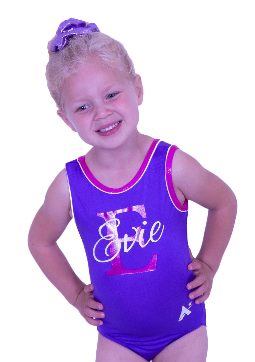 Personalised Purple lycra gymnastics leotard. The background letter will be the first letter of the name unless requested otherwise. Great for training.