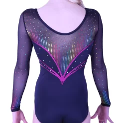 Girls long sleeved Black shiny lycra leotard with Blackberry Shimmer and Black powernet details, finished with a colourful print
