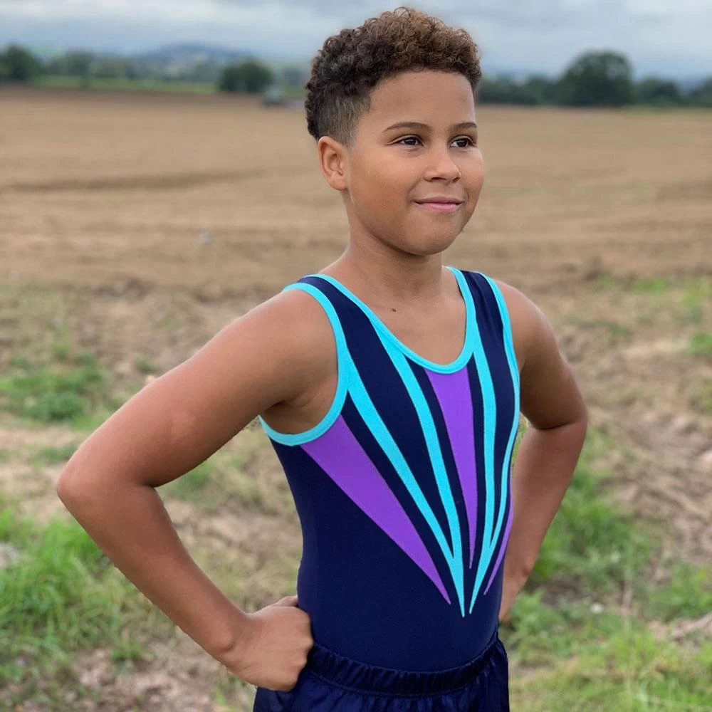 Boys gymnastics leotard in Navy shiny lycra with Aqua and Purple details. Made from comfortable and stretchy lycra so perfect for training!