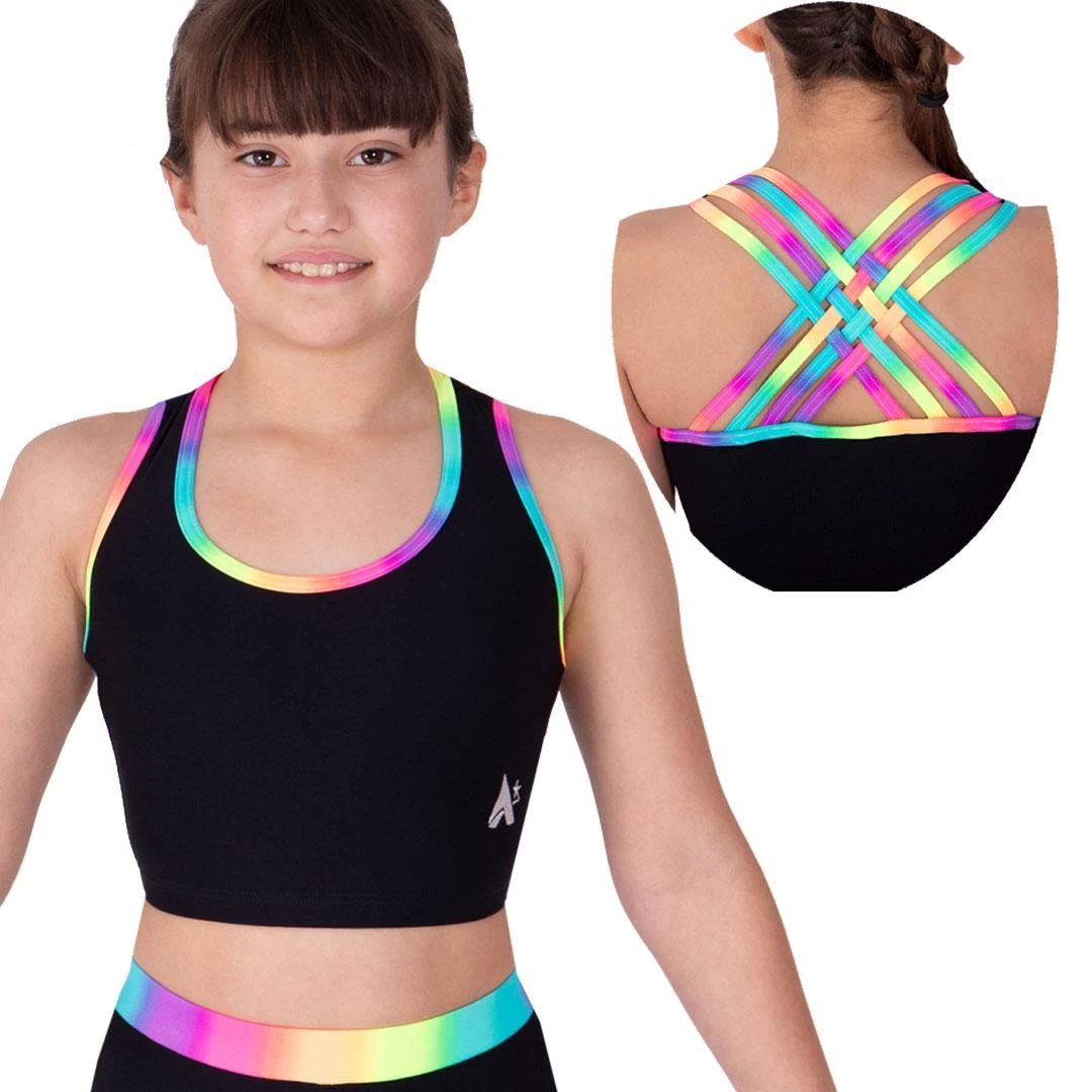 This lovely crop top and shorts set is ideal for training and leisure. The soft matt body is breathable and offers great stretch to allow you to train with confidence. The pretty shoulder straps are made from Rainbow fabric. This gorgeous printed lycra is soft durable and delicate. Why not team this sports bra top with your favourite A Star leggings. We have a whole range in Rainbow sunrise, search the website to view!