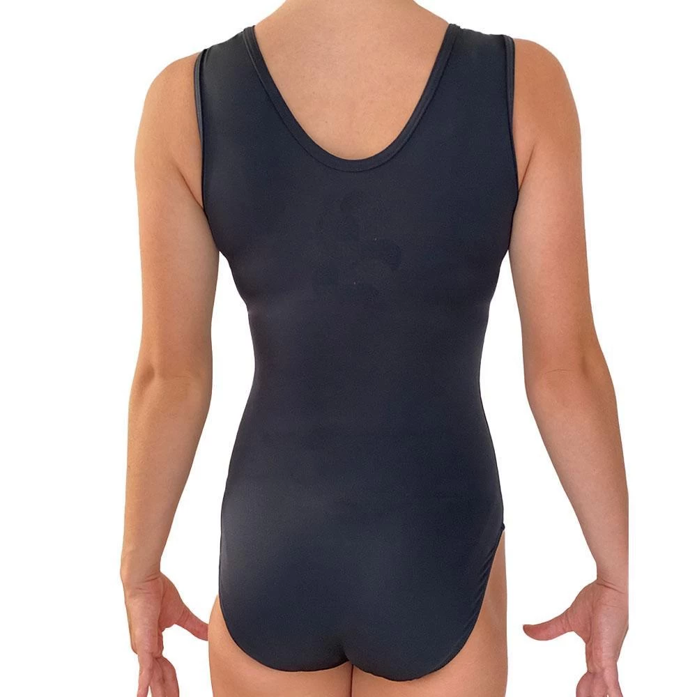 Black Shiny lycra sleeveless leotard with beautiful Rose Gold flower print. The perfect, subtle training leotard with sparkly diamante gems.