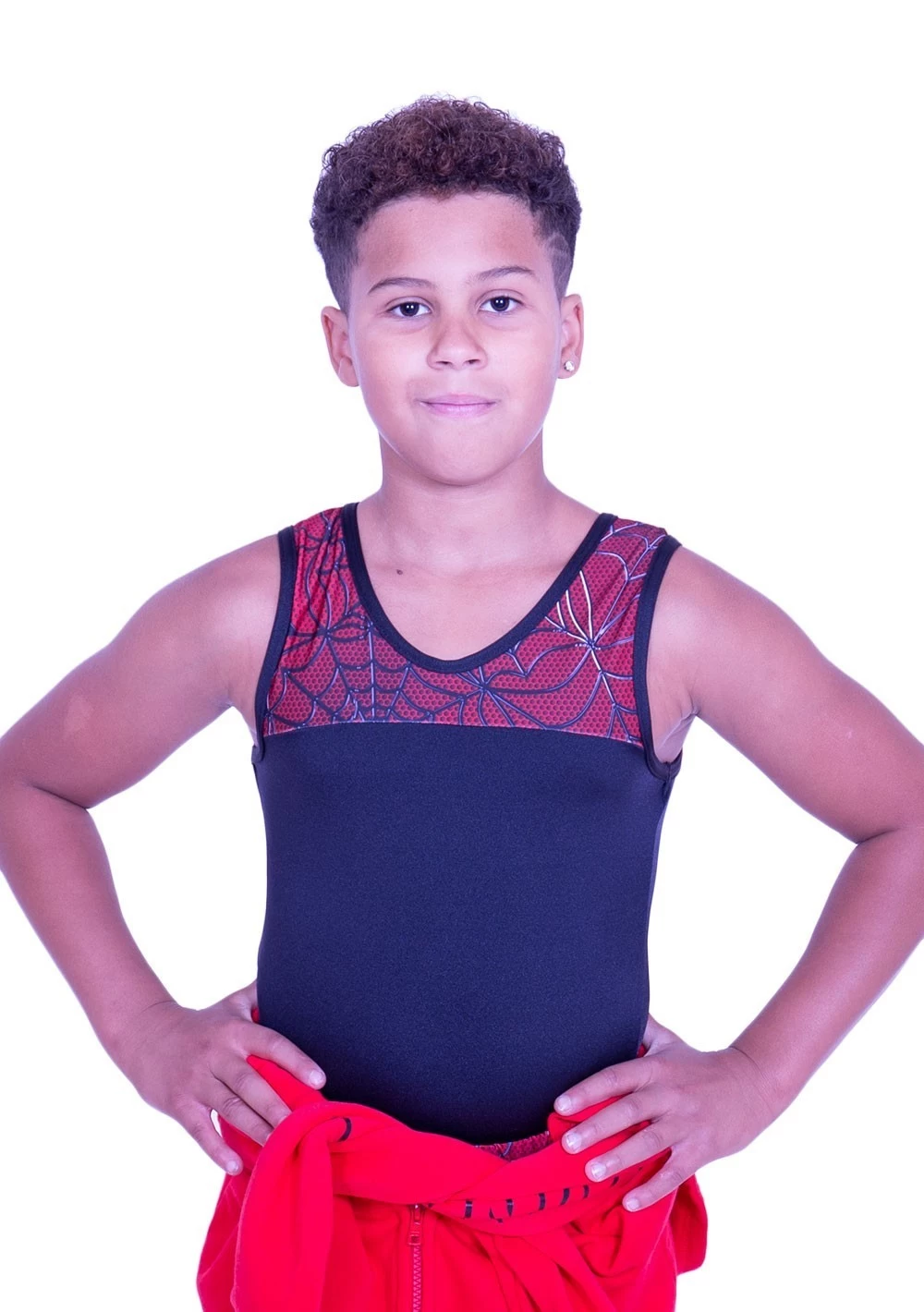 Boys leotard in Black lycra with Spidey pattern top, great for training. Comfortable lycra fabrics with 4-way stretch. Matching shorts available.