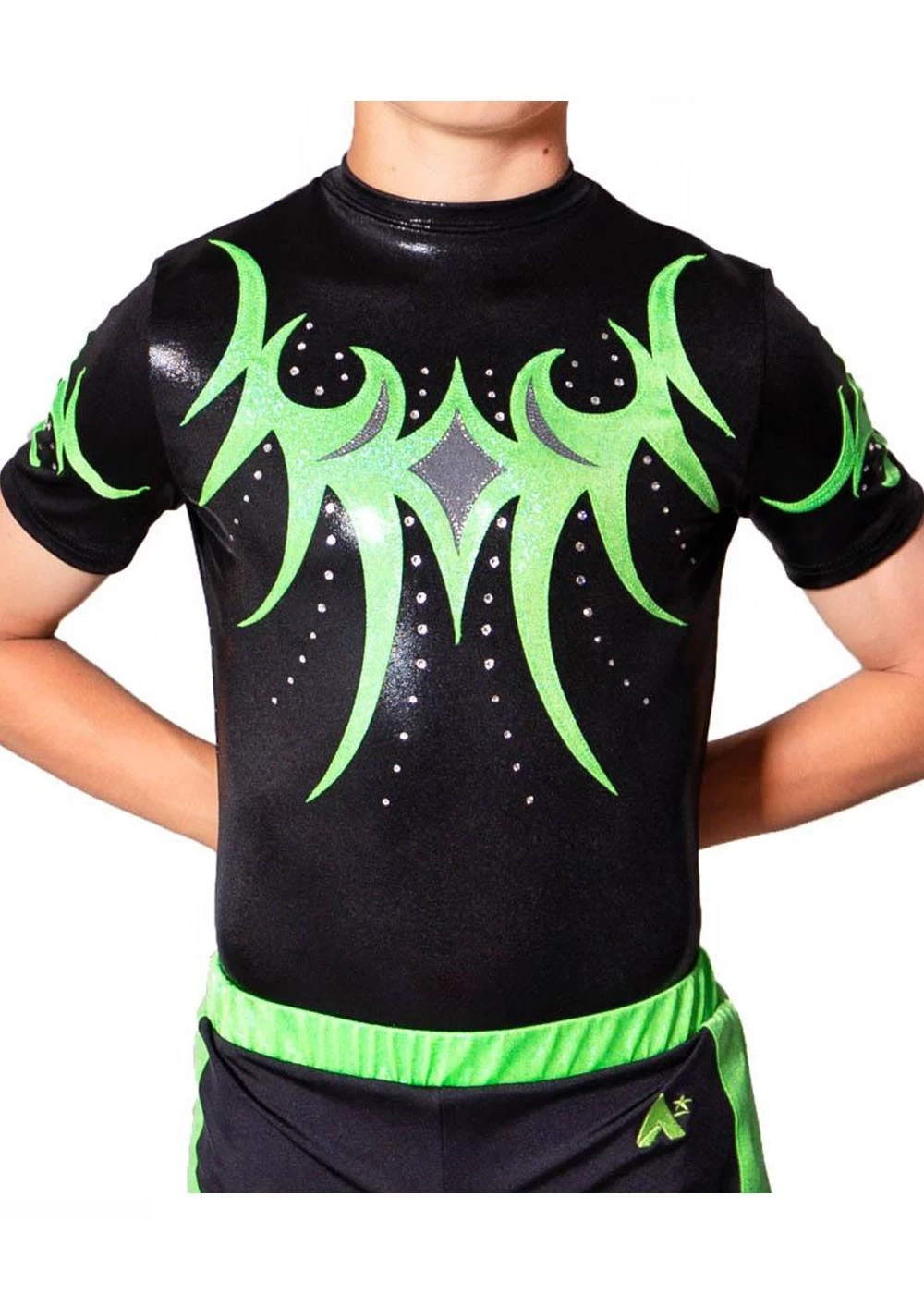 Mens/boys acro competition leotard. Black foiled shimmer body with clover details.