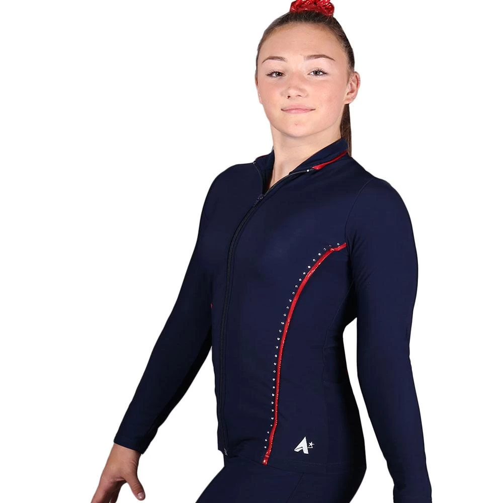 These zip through jackets have been designs with gymnastics competitions in mind, avoid overhead tops that can ruin competition hair and makeup. We offer much more than customised tracksuit jackets so whatever your kit needs, A Star can help. We handmake our leotards, tracksuits, gym shorts and boys trampoline kit here in the UK so we can adapt any design to meet your team needs.