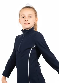 Half zip tracksuit jacket in our popular TS12 style. This smart design is great for all shapes and ages. We have create a simple jacket using Navy Microtex and Silver shimmer piping but as we hand make our quality tracksuits in the UK, we can adapt this design to suit your needs. We can change the colours, add your team logo or club name, offer matching tracksuit bottoms and much more. We also offer this design as a male tracksuit jacket so you can kit out your whole. We offer great discounts for groups on gymnastics team tracksuits.