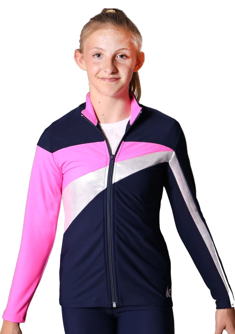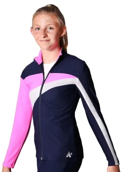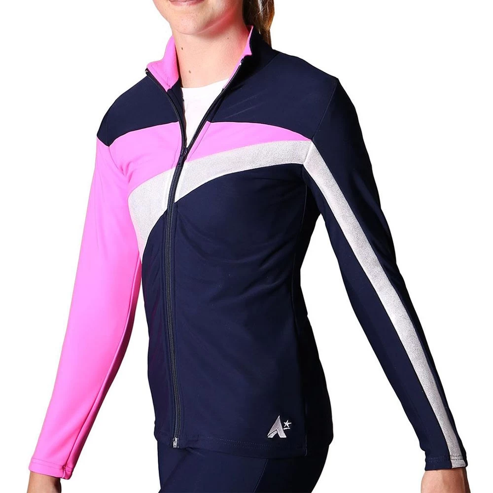 We handmake our custom tracksuits in the UK so we can offer this design in your team colours, add your logo or team name in diamante, print or embroidery. We can supply matching trackpants in leggings, bootleg or straight leg styles. We also offer a male tracksuit jacket to match to create a uniform look for your whole squad. This girls zip through tracksuit jacket is smart and fitted making it perfect for travelling to and competing at competitions. Pockets are not normally requested in childrenโs tracksuit jackets but we can offer these for an additional charge. We offer great team discounts on bespoke quality gymnastics tracksuits so for more information on pricing, get in touch!